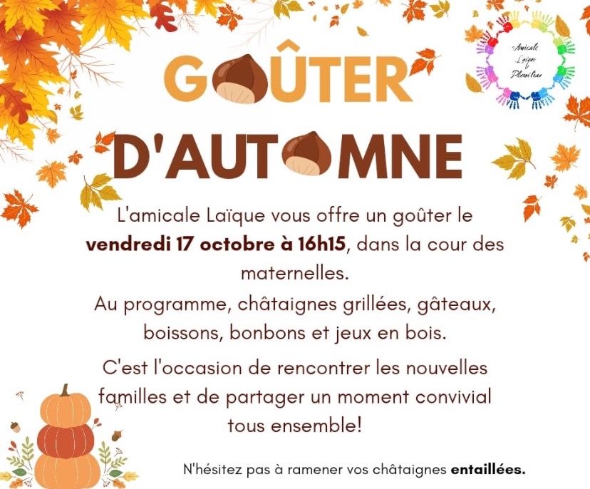L’Amicale Laïque vous invite à un goûter d’automne dans la cour de l’école pour un moment convivial avant les vacances.